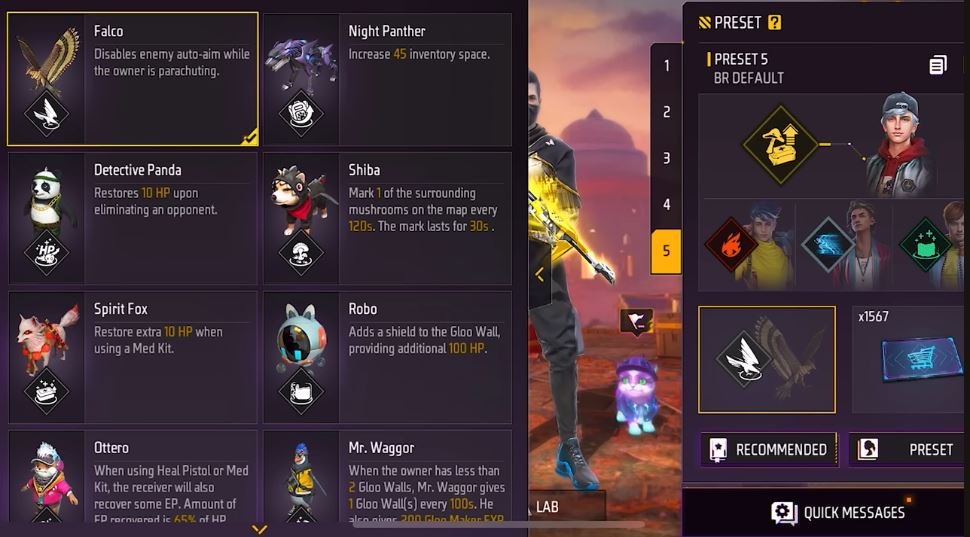 Falco is one of the most useful pets in Free Fire because it increases landing speed for you and your squad. The player who lands first gets the advantage to loot weapons before enemies. Early loot means higher survival chances and more control during early fights.