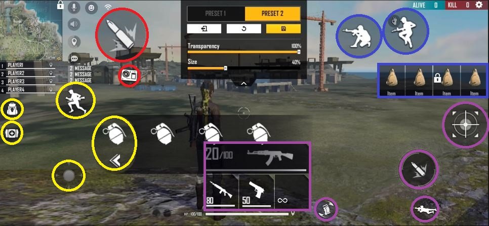 NOTE: Place the joystick comfortably for your thumb’s natural movement. Ensure grenades and medkits are reachable without lifting your thumb off the joystick. Practicing in training mode helps you throw grenades while moving smoothly, preventing awkward delays during enemy encounters.