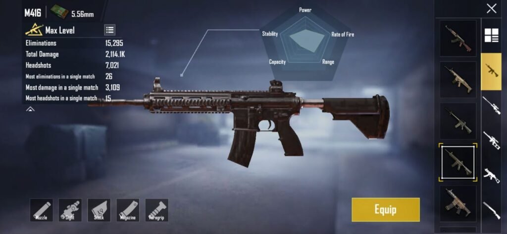 The M416 is widely considered the most reliable and all-rounded assault rifle in PUBG Mobile. It provides a perfect balance between damage, accuracy, and stability. With proper attachments (extended mag, compensator, vertical grip, tactical stock), the M416 becomes a laser-like gun that excels in both short and long-range fights.