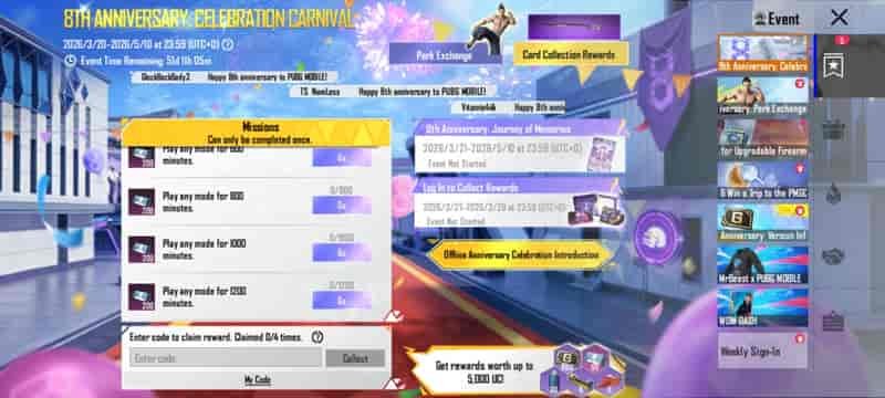 During special events like anniversary celebrations, PUBG Mobile provides free character vouchers through missions. In events such as the 8th Anniversary Celebration Carnival, players can earn up to 1200 character vouchers for free.