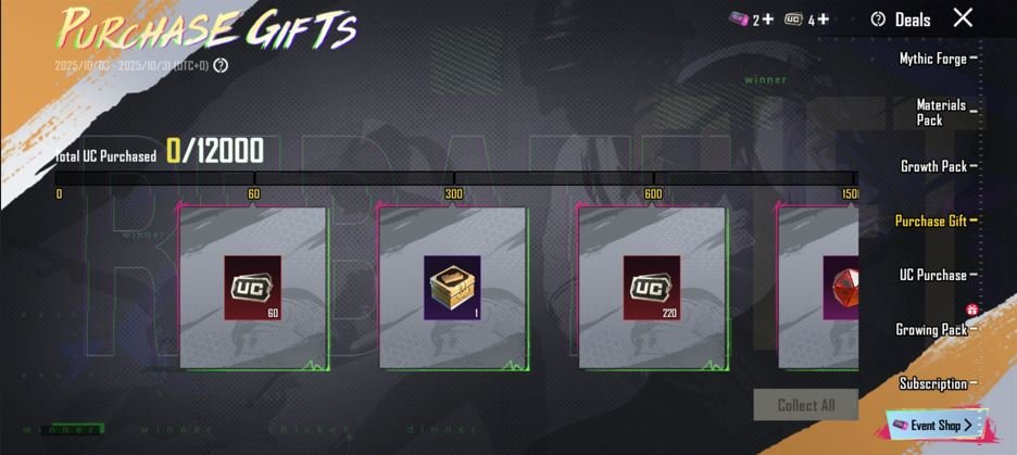 - Top-up 12,000 UC → Fortune Pack (random UC rewards: 1200, 1800, 2400, 3000, 4800, 6000 UC)