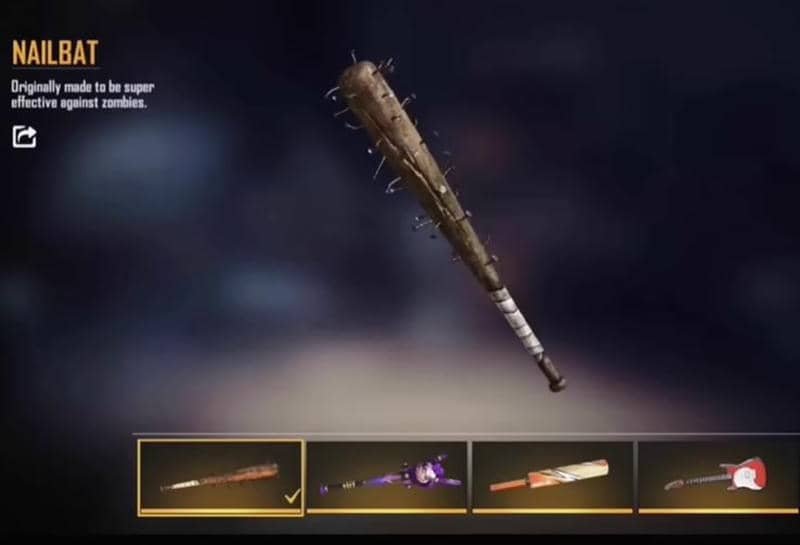 The Nail Bat is one of the oldest melee skins in Free Fire, known for its brutal and intimidating design. It features a wooden bat covered with sharp metal nails, giving it a dangerous combat appearance. It was introduced through early Elite Passes and seasonal events between 2018 and 2019. Since it was part of limited-time rewards, only OG players managed to unlock it. It does not affect gameplay stats but holds strong visual and collectible value. Today, players consider it a nostalgic item representing Free Fire’s early era.